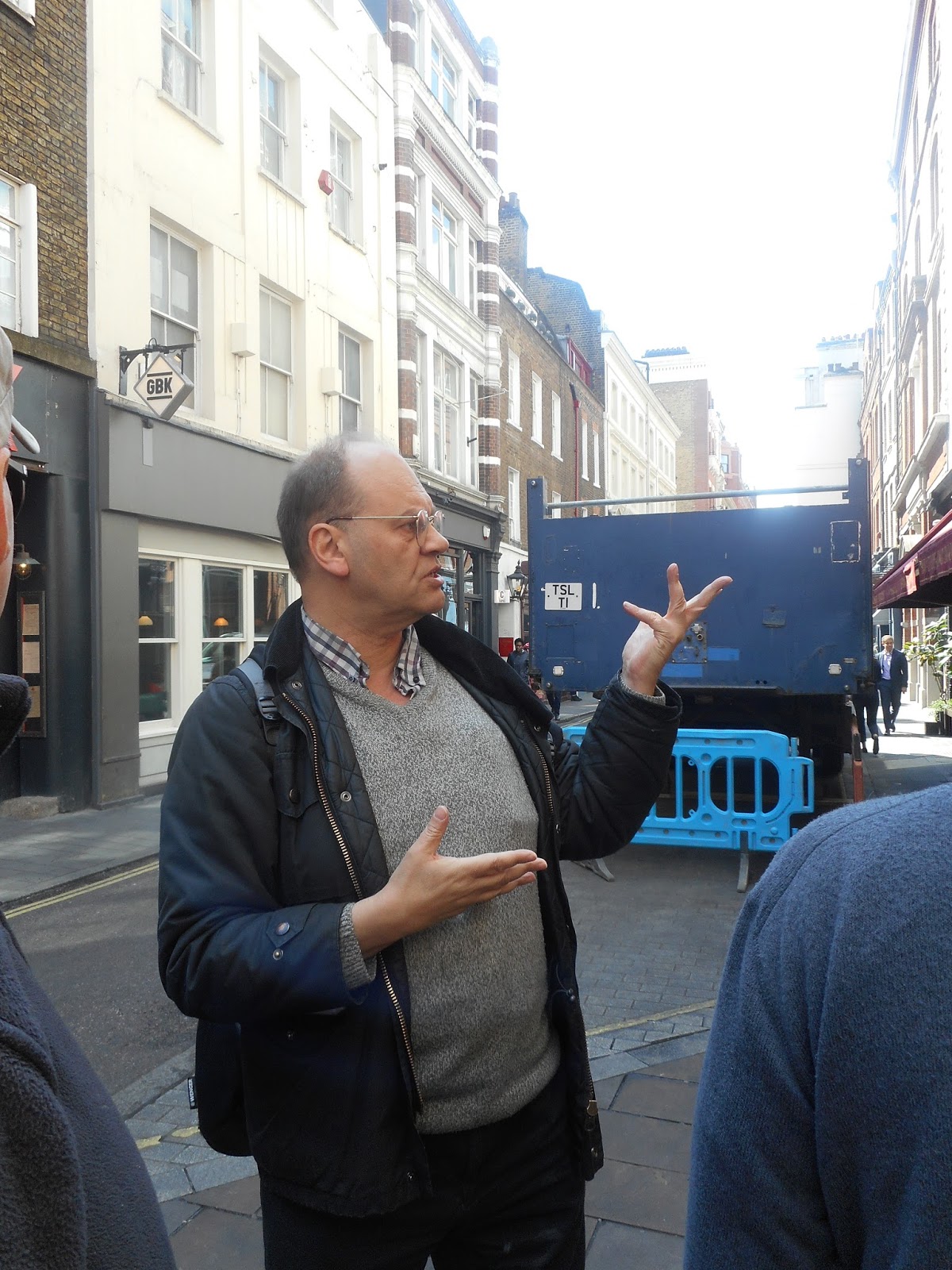 1. Outside the Actors’ Church, St.Paul’s, Covent Garden The group photo at the start. Ten of us gathered next to the pillared portico and our guide is centre-left, (with his hands clasped in front of him), standing beside Debbie, our Essex Branch Publicity Officer, (she is wearing a bag slung over her shoulder). We were all intrigued by the talk last October on ‘The Making of the West End of London in the C19th’ and the subsequent offer to show us the historic sites that prompted the talk which will lead to Professor McWilliam’s books. It was a sunny Spring day, though none too warm – perfect for walking.